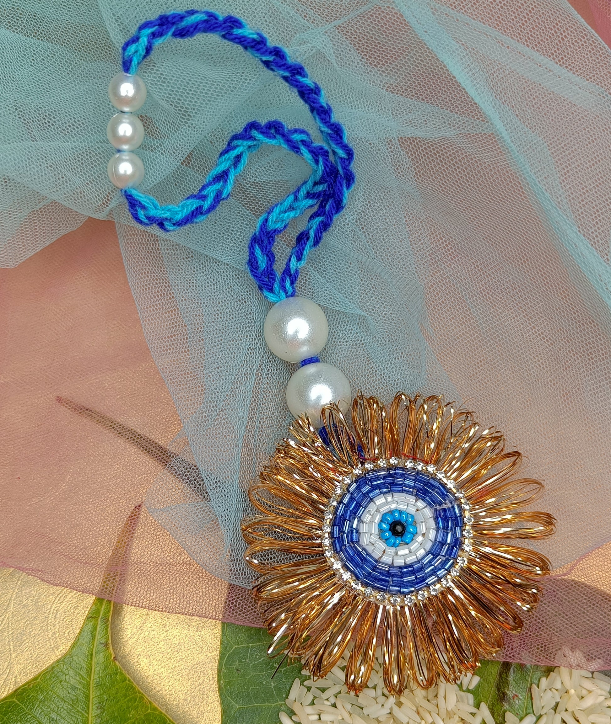 ✅ A round evil eye Rakhi adorned with shimmering blue, white, and gold beads, symbolizing warding off negativity.