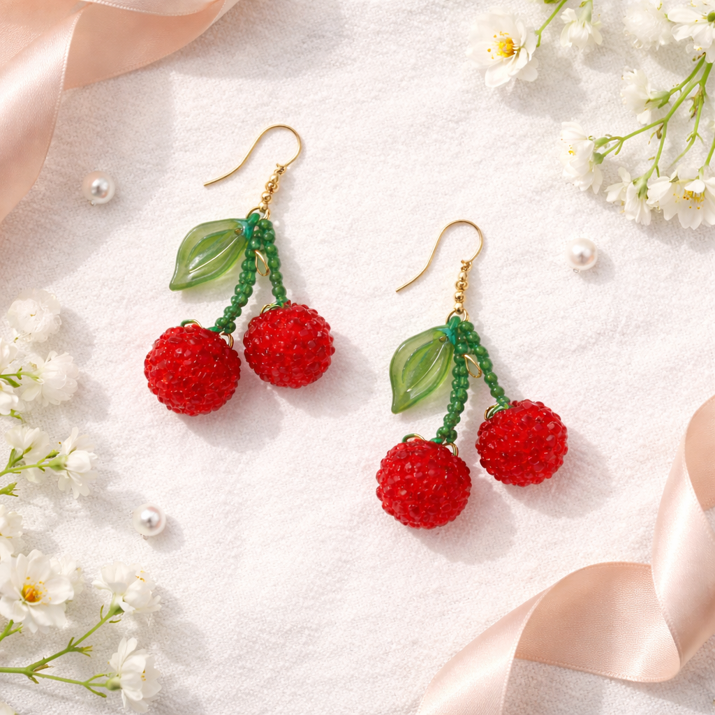 Cherry Pop Beaded Earrings | Handmade Red Cherry Drop Earrings for Women