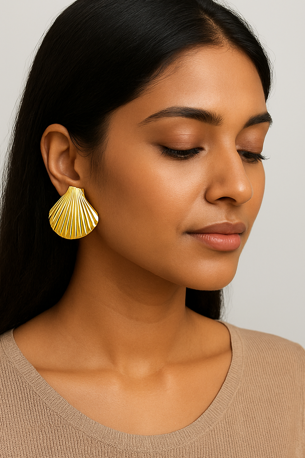 Bring a touch of coastal elegance to your style with these beautifully crafted gold plated seashell earrings. Designed with intricate ridges and a polished finish, they perfectly combine traditional charm with a modern, trendy vibe. Lightweight and comfortable to wear, these statement earrings are ideal for casual outings, festive occasions, or pairing with chic everyday outfits.