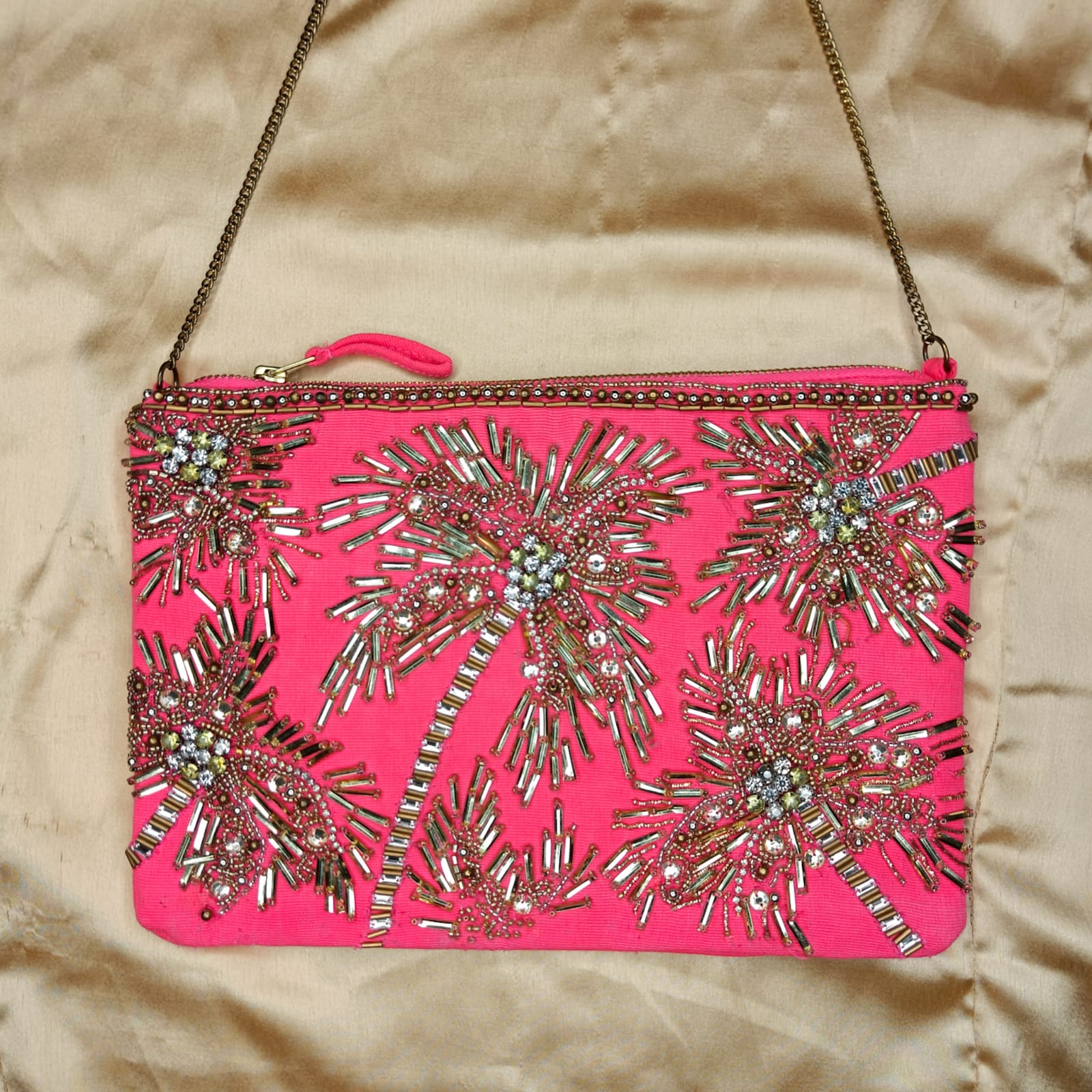 A colorful handbag completely made of fabric. Embellished with stones and beads. A masterpiece of designing with extreme boho swag. Extremely lightweight with ample of storage.