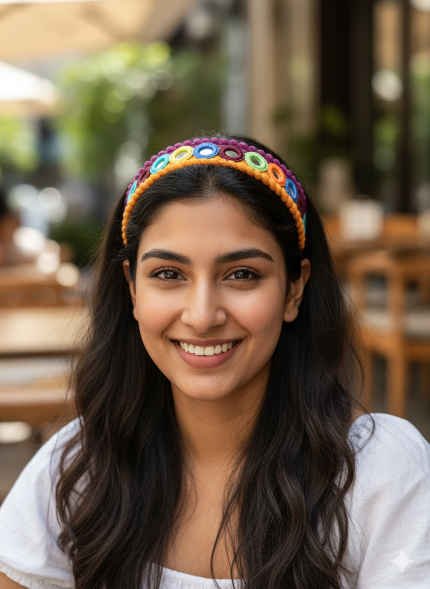 A chic blend of tradition and trend, this hairband features delicate mirror work set within colorful embroidered rings. Accented with vibrant thread and finished with a soft padded base, it’s the perfect accessory to add a festive yet playful touch to your look. Ideal for styling with both ethnic and fusion outfits.