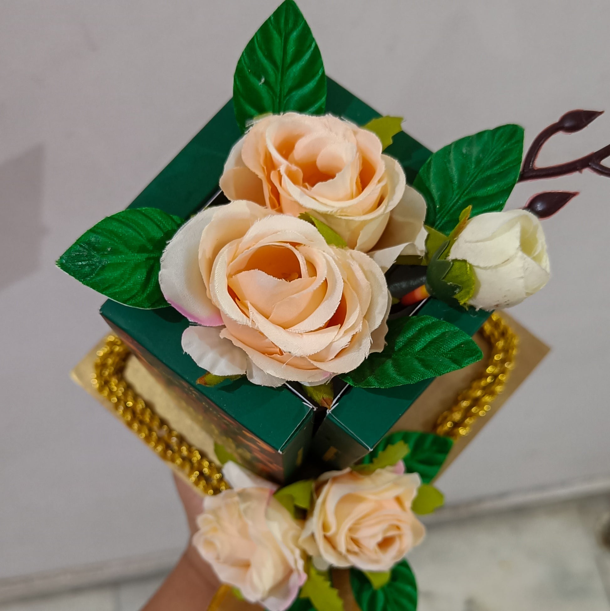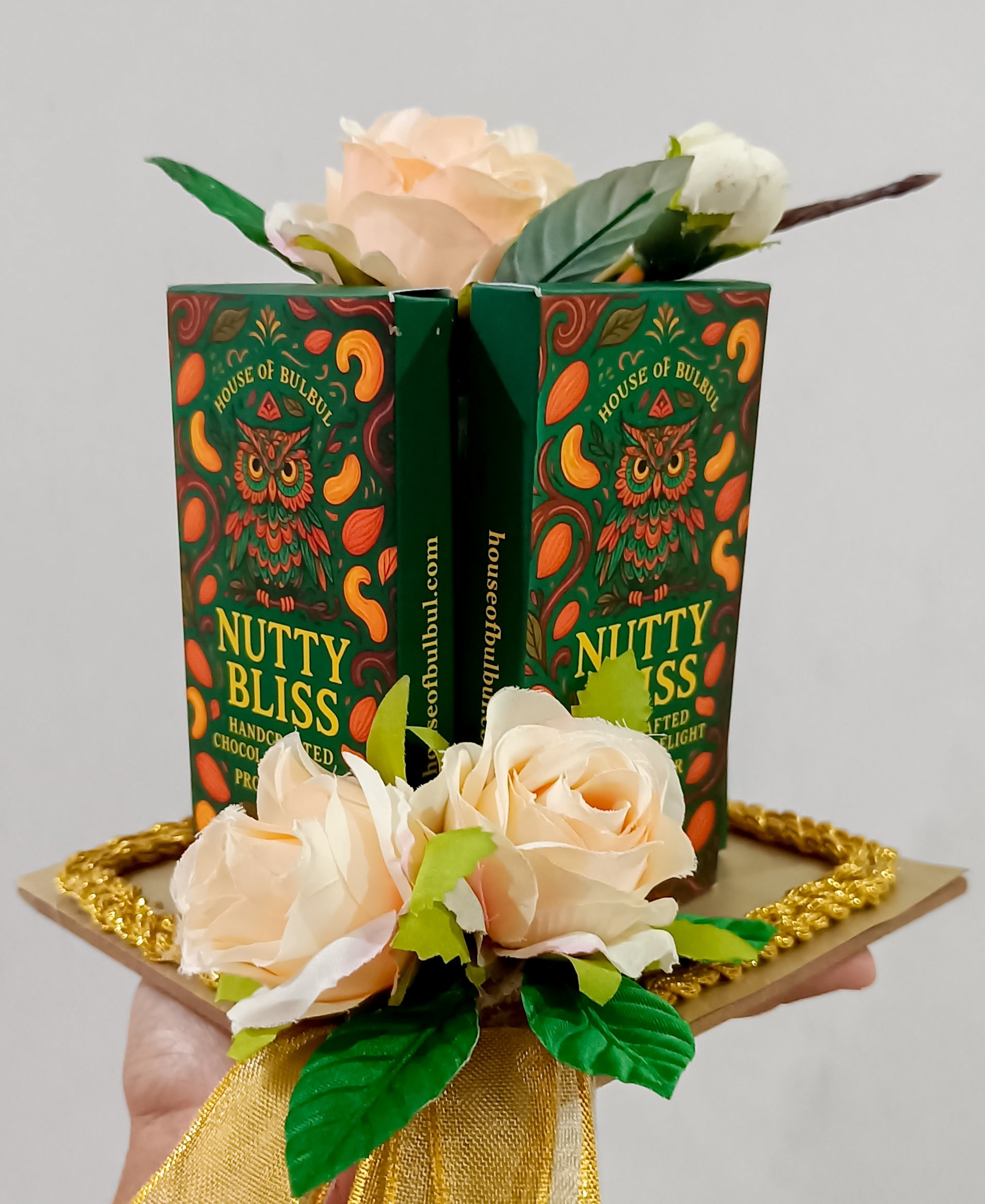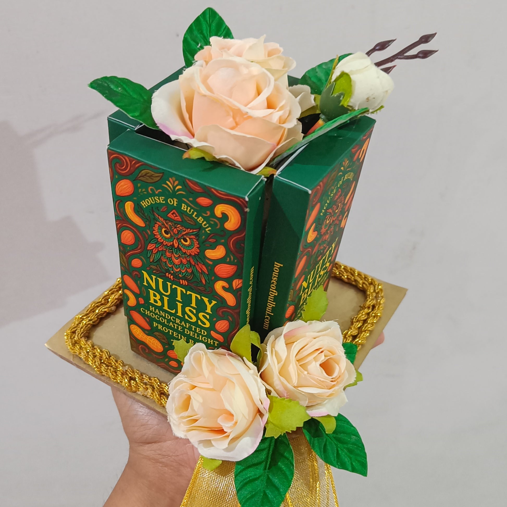 A bouquet like no other! We’ve beautifully curated this one-of-a-kind gift by combining four bars of our handcrafted Nutty Bliss chocolate — a rich blend of roasted nuts, dry fruits, and pure delight. Styled like a blooming bouquet, we’ve topped the arrangement with elegant artificial roses, symbolizing love, prosperity, and abundance.