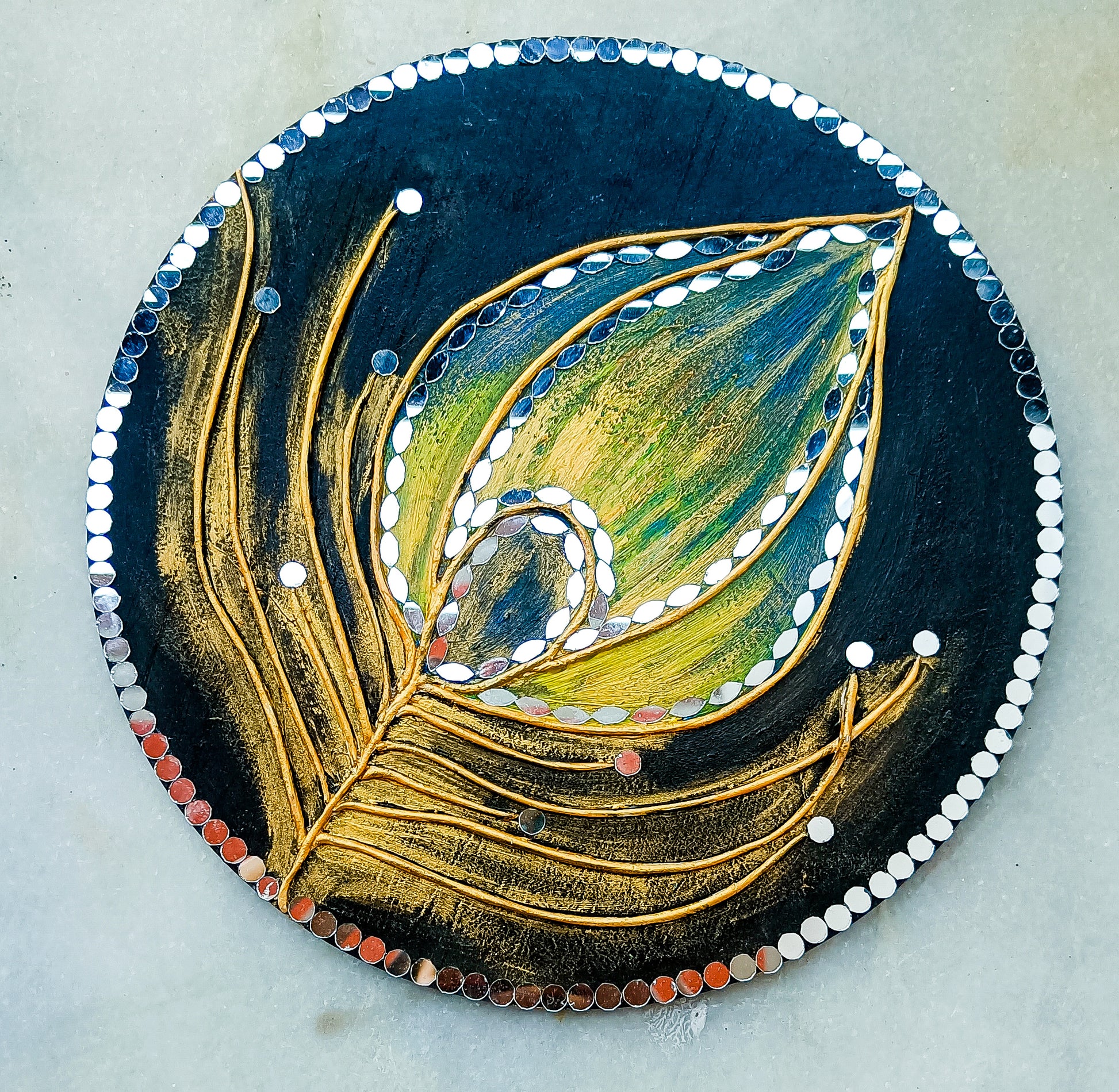 The wall plate design features a stunning, single peacock feather as its central motif. The feather, meticulously detailed, showcases a rich palette of iridescent blues, greens, and hints of gold, capturing the intricate beauty and elegance of a real peacock feather. The eye of the feather, with its vibrant hues, serves as the focal point, drawing attention with its mesmerizing detail. The background is a smooth, ivory or off-white, providing a clean and sophisticated contrast that highlights the feather's vivid colors. Subtle, swirling patterns in soft metallic tones extend outward from the feather, adding a touch of movement and grace. The edges of the plate are gently scalloped or bordered with a thin gold or silver line, enhancing the overall elegance. This design brings a touch of regal splendor and artistic charm to any space, making it a perfect statement piece for those who appreciate the beauty of nature and refined craftsmanship