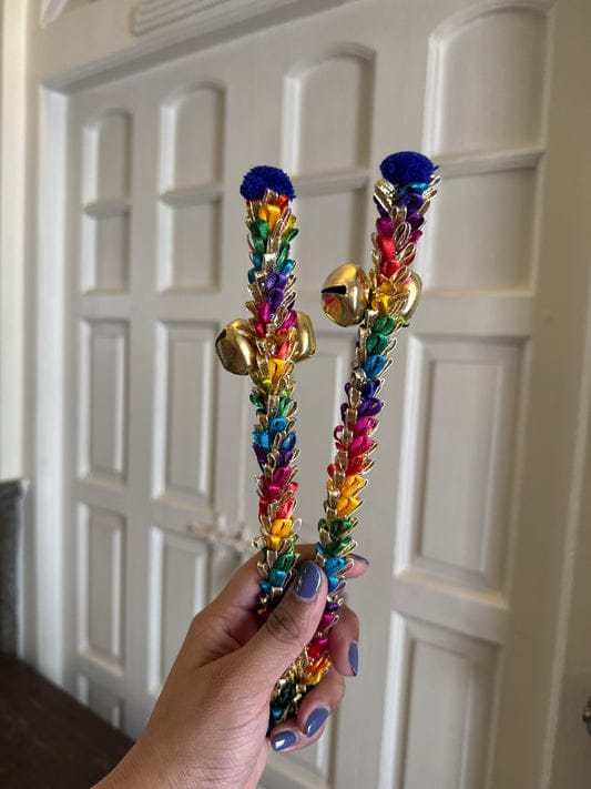 Bring the sound of celebration to life with these vibrant ghungroo sticks, crafted with multicolor gota work, pom-poms, and metallic ghungroos. Perfect for wedding entries, baraat, mehendi, sangeet, and festive functions, they add fun, rhythm, and tradition to every occasion.