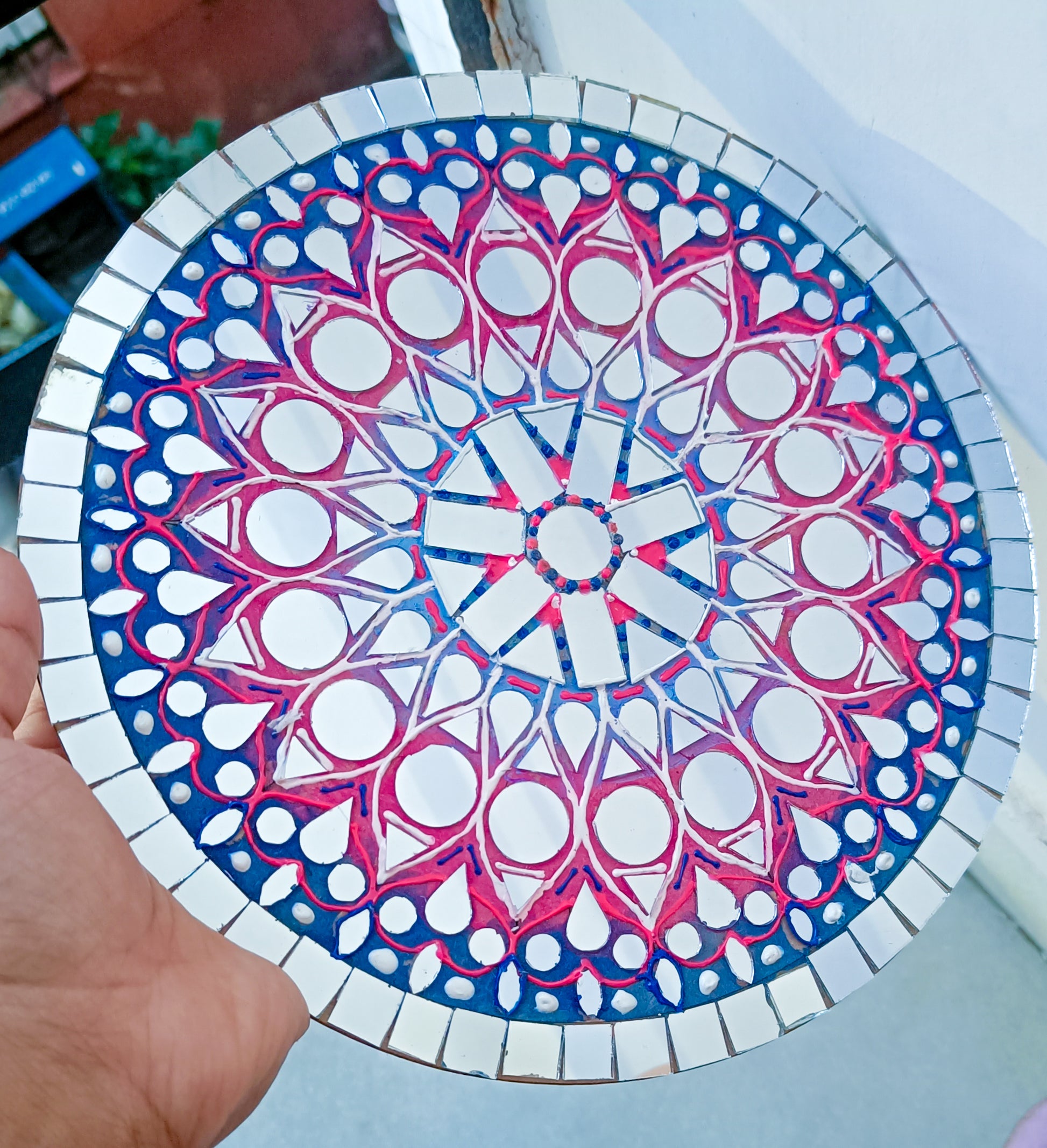 A wall plate designed with a mandala theme, featuring a combination of mirror work and intricate painting. The base of the plate is crafted from a sturdy material like ceramic or wood. The central area of the plate is adorned with a circular mirror, reflecting light and creating a radiant focal point. Surrounding the mirror, the mandala design unfolds with meticulous detail, using vibrant colors like deep blues, rich purples, and shimmering golds. The mandala pattern radiates outward in symmetrical, geometric shapes, with each layer more intricate than the last, blending traditional and contemporary artistic elements. The use of the mirror adds depth and dimension, making the plate a striking decorative piece.