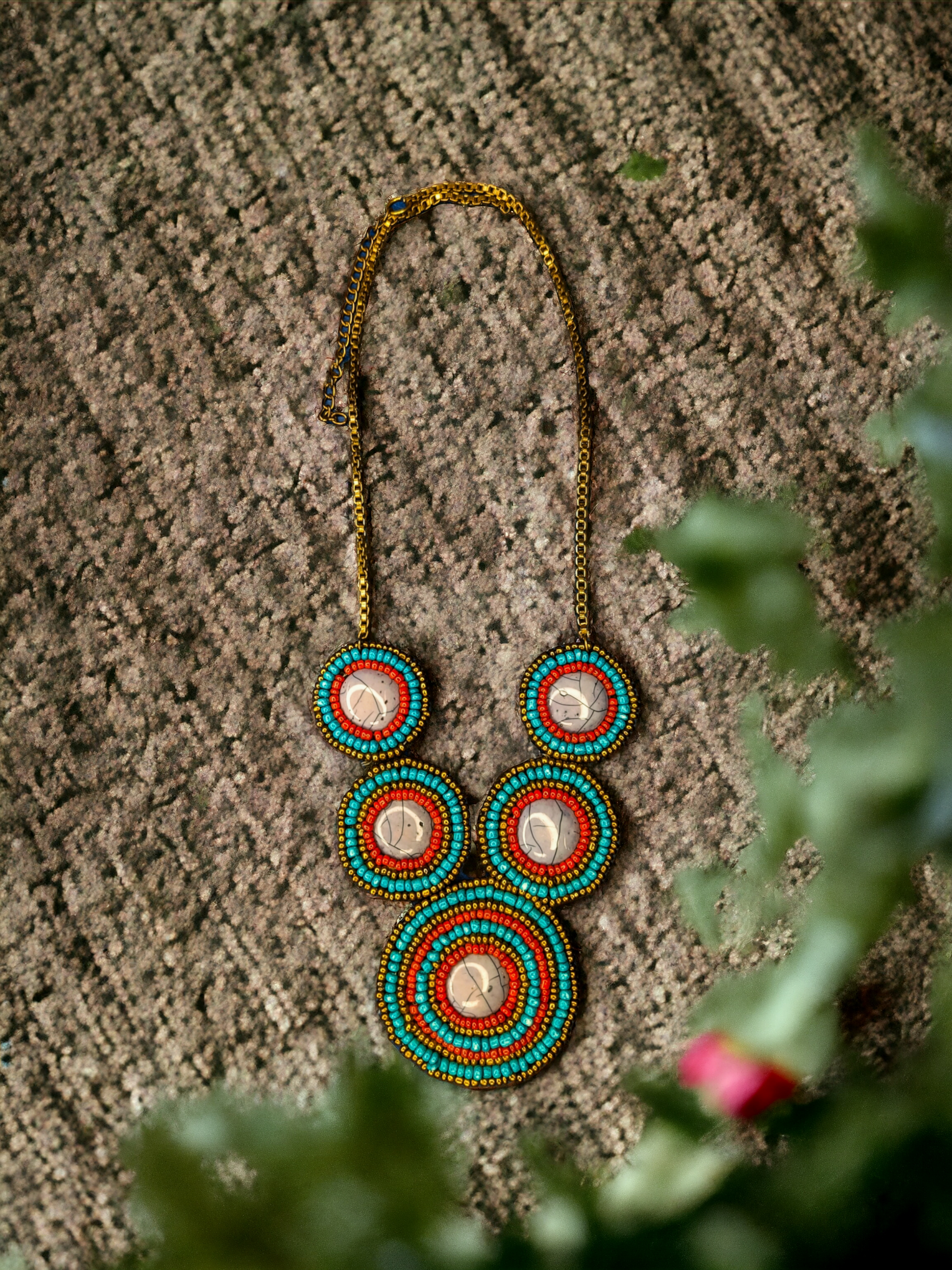 Handmade necklace, embroidered and embellished with beads and stones. An iconic piece to go with your best outfit. Fusion of indo-western style. Completely handmade by our fellow artisans.
