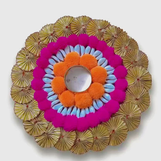 Enhance your festive décor with this beautifully handcrafted 8-inch rangoli plate. Designed with vibrant orange and pink accents, white shells, and golden motifs, it creates a stunning floral-inspired pattern. The center features a dedicated diya space, making it perfect for Diwali, puja rituals, weddings, or home décor. Lightweight yet elegant, this rangoli plate adds a touch of tradition and charm to your celebrations.