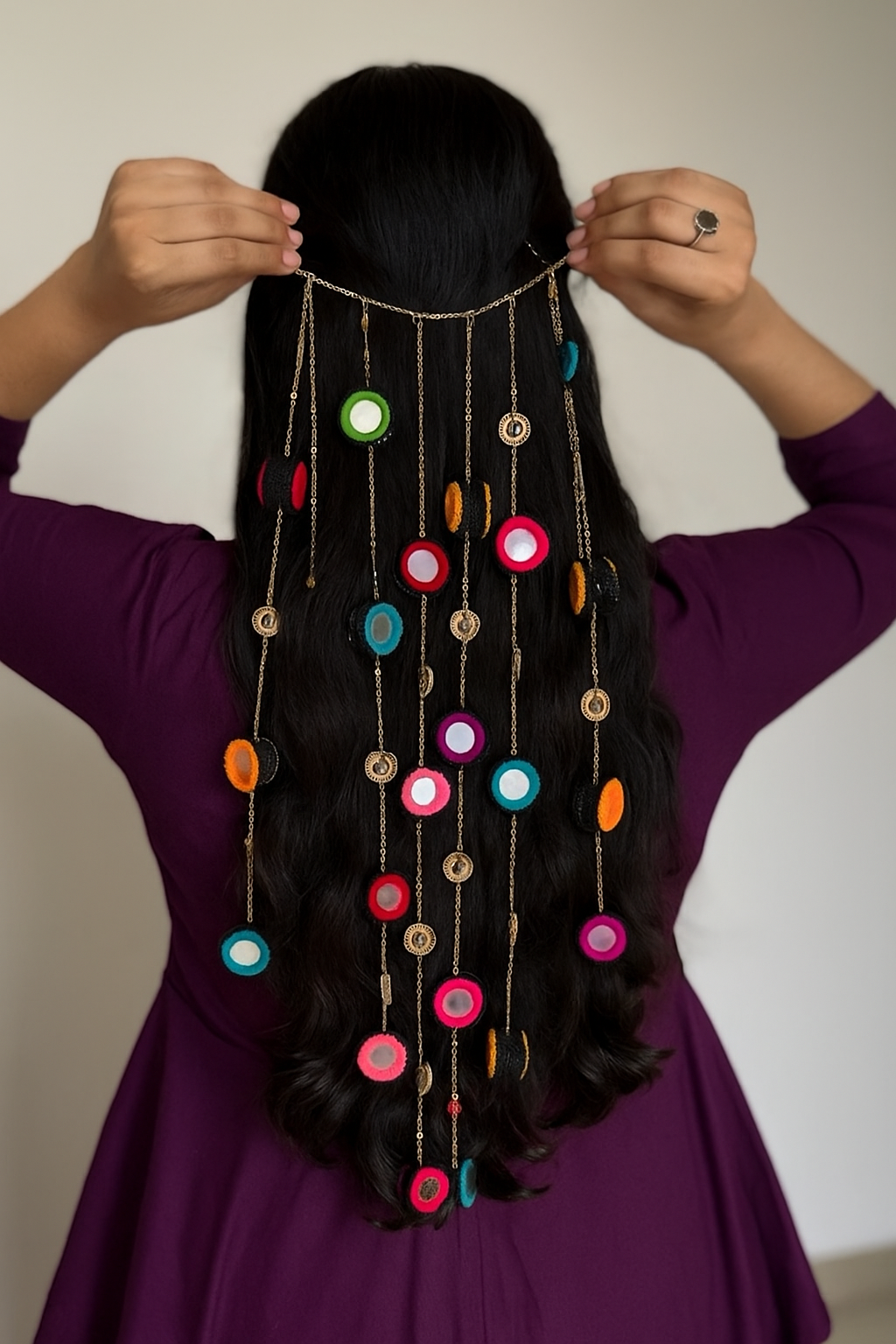 Elevate your hairstyle with this stunning bohemian hair chain accessory, crafted with vibrant fabric discs and delicate golden chains. Perfect for weddings, festivals, or everyday glam, this statement piece adds a playful yet elegant charm to your look. Lightweight, versatile, and easy to style, it pairs beautifully with traditional outfits as well as modern ensembles. A must-have for those who love bold, artsy, and boho-inspired fashion.